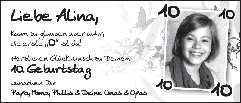 Hier finden Sie alle Familienanzeigen aus der Zeitung, die bisher für Alina erschienen sind. Weitere Familienanzeigen, die in der Zeitung erscheinen, werden hier ebenfalls aufgelistet