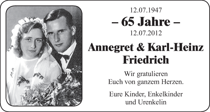 Hier finden Sie alle Familienanzeigen aus der Zeitung, die bisher für Annemarie und Karl-Heinz Friedrich erschienen sind. Weitere Familienanzeigen, die in der Zeitung erscheinen, werden hier ebenfalls aufgelistet