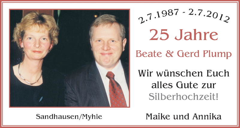 Hier finden Sie alle Familienanzeigen aus der Zeitung, die bisher für Beate und Gerd Plump erschienen sind. Weitere Familienanzeigen, die in der Zeitung erscheinen, werden hier ebenfalls aufgelistet