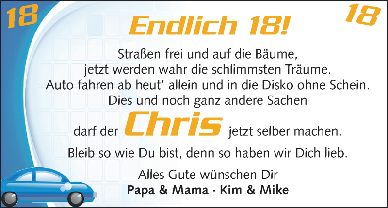 Hier finden Sie alle Familienanzeigen aus der Zeitung, die bisher für Chris erschienen sind. Weitere Familienanzeigen, die in der Zeitung erscheinen, werden hier ebenfalls aufgelistet
