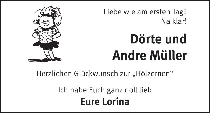 Hier finden Sie alle Familienanzeigen aus der Zeitung, die bisher für Dörte und Andre Müller erschienen sind. Weitere Familienanzeigen, die in der Zeitung erscheinen, werden hier ebenfalls aufgelistet