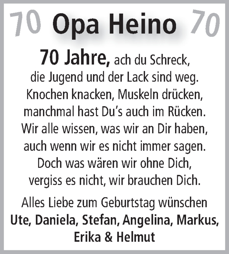 Hier finden Sie alle Familienanzeigen aus der Zeitung, die bisher für Heino erschienen sind. Weitere Familienanzeigen, die in der Zeitung erscheinen, werden hier ebenfalls aufgelistet