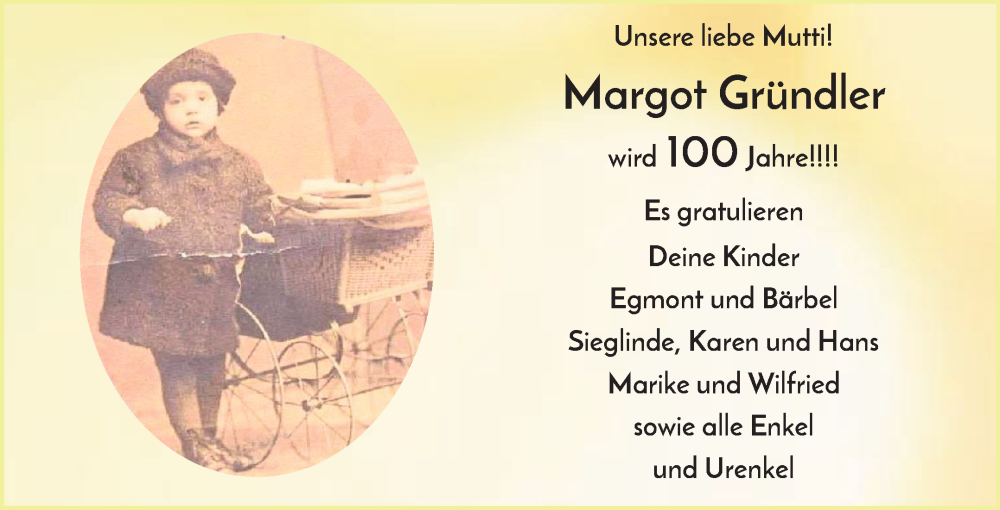 Hier finden Sie alle Familienanzeigen aus der Zeitung, die bisher für Margot Gründler erschienen sind. Weitere Familienanzeigen, die in der Zeitung erscheinen, werden hier ebenfalls aufgelistet