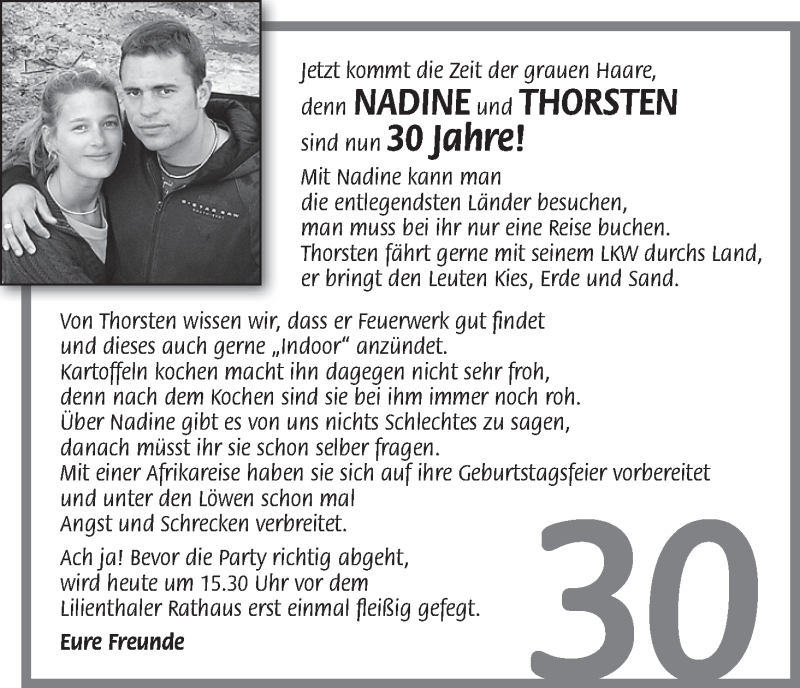 Hier finden Sie alle Familienanzeigen aus der Zeitung, die bisher für Nadine und Thorsten erschienen sind. Weitere Familienanzeigen, die in der Zeitung erscheinen, werden hier ebenfalls aufgelistet