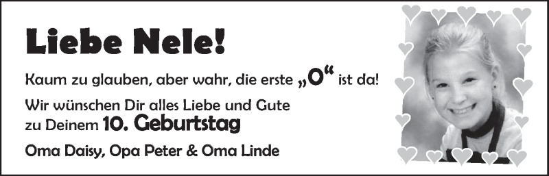 Hier finden Sie alle Familienanzeigen aus der Zeitung, die bisher für Nele erschienen sind. Weitere Familienanzeigen, die in der Zeitung erscheinen, werden hier ebenfalls aufgelistet