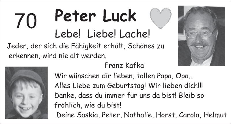 Hier finden Sie alle Familienanzeigen aus der Zeitung, die bisher für Peter Luck erschienen sind. Weitere Familienanzeigen, die in der Zeitung erscheinen, werden hier ebenfalls aufgelistet