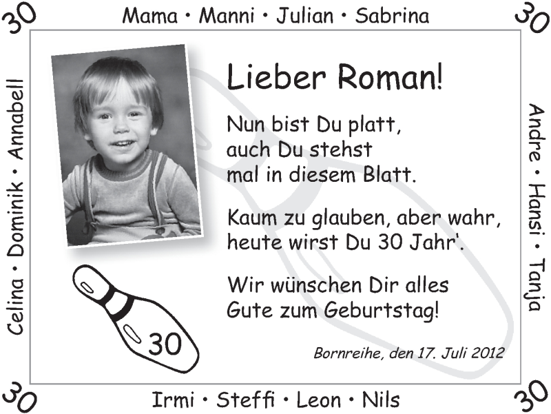Hier finden Sie alle Familienanzeigen aus der Zeitung, die bisher für Roman erschienen sind. Weitere Familienanzeigen, die in der Zeitung erscheinen, werden hier ebenfalls aufgelistet